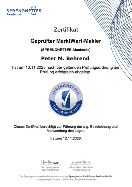 Peter M. Behrend ist gelernter Industriekaufmann, studierter und staatlich geprüfter Betriebswirt, geprüfter Ausbilder (HWK), geprüfter Marktwert-Makler (Sprengnetter Akademie), DEKRA zertifizierter Sachverständiger für Immobilienbewertung D1plus, BDSH-geprüfter und DGSV - geprüfter und zertifizierter Sachverständiger, DEKRA zertifizierter Immobilienmakler (auf Grundlage der DIN EN ISO 17024) sowie von der Stadt Peine zugelassener Immobilien-Auktionator. Er war als Standortleiter, Handlungsbevollmächtigter und Prokurist in Industrie, Handel, Finanz- und Immobiliendienstleistung tätig und verfügt als eingetragener Kaufmann im Registergericht Hildesheim über die Zulassung als Immobilienmakler nach §34c GewO der Stadt Peine, die Zulassung als Versicherungsmakler nach §34d Abs.1 GewO der IHK Braunschweig, die Erlaubnis nach §34i Abs. 1 Satz 1 GewO als Immobiliar-Darlehensvermittler der IHK Braunschweig sowie die Zulassung als Versteigerer (Auktionator) nach §34b Abs.1 GewO der Stadt Peine. Seit 2024 agiert Peter M. Behrend vorrangig als privater Immobilieninvestor, wobei er für ausgewählte Projekte der PMBimmobilien weiterhin Ansprechpartner bleibt.